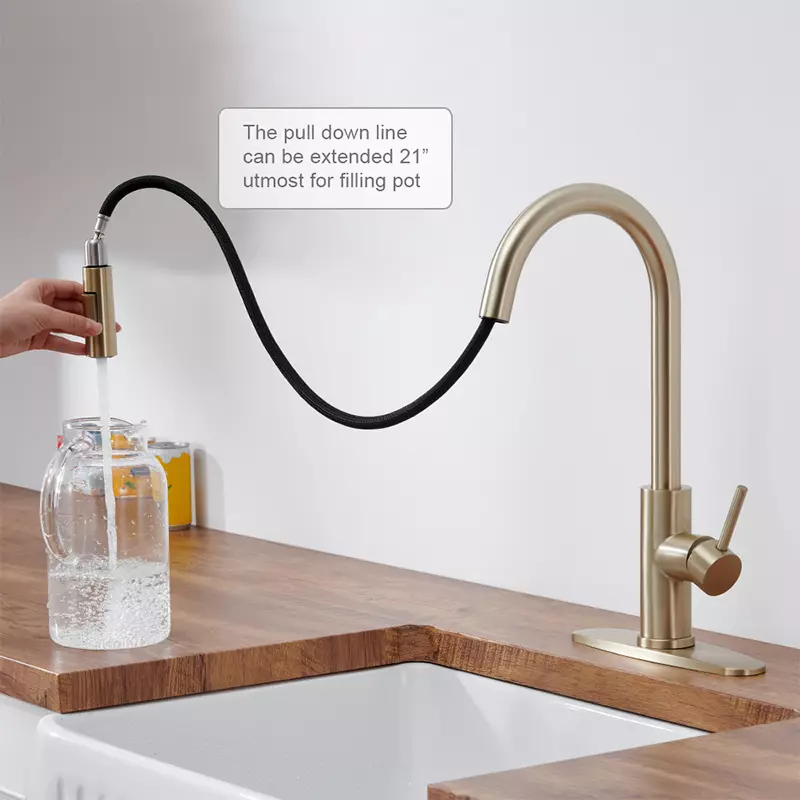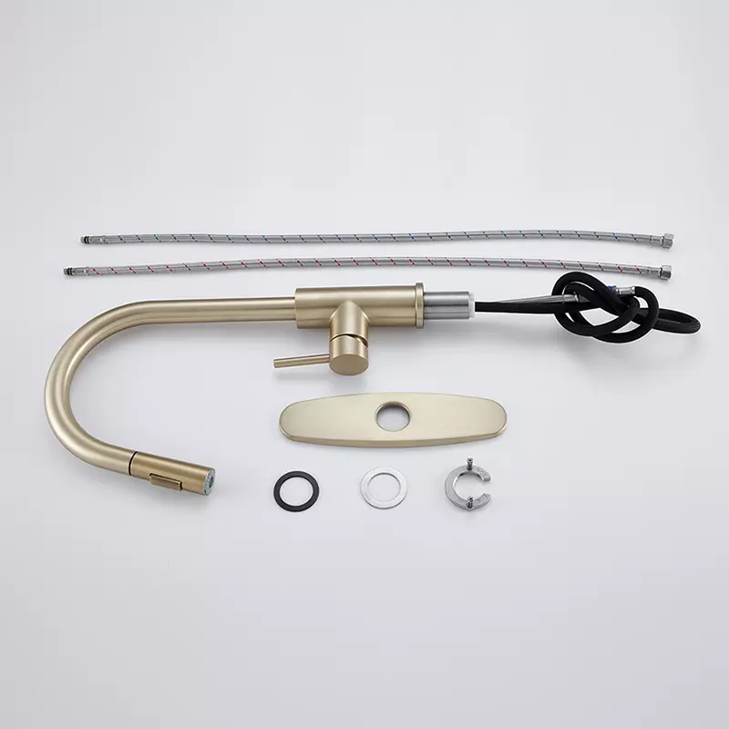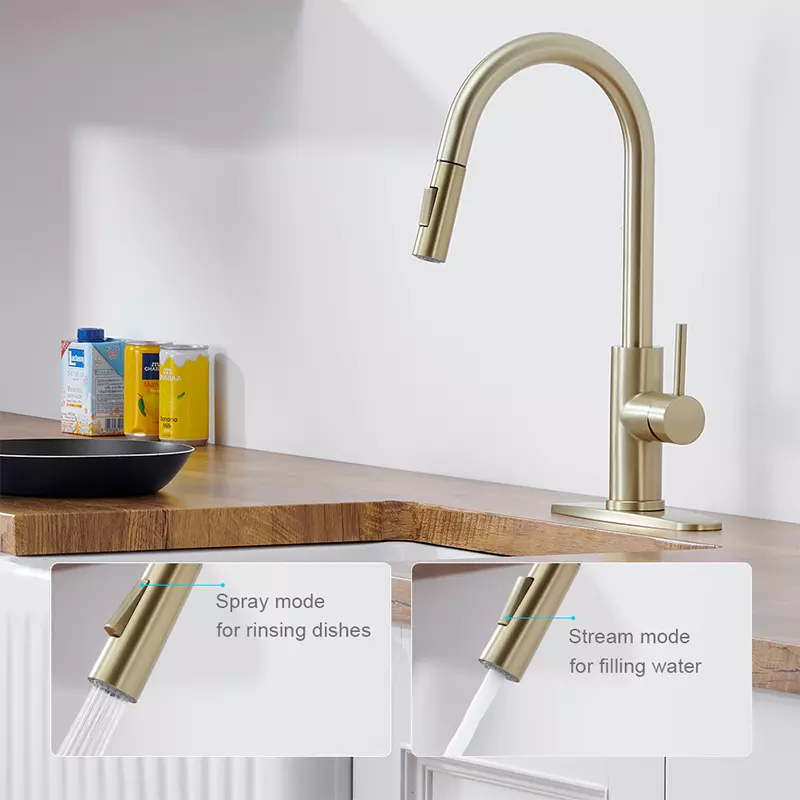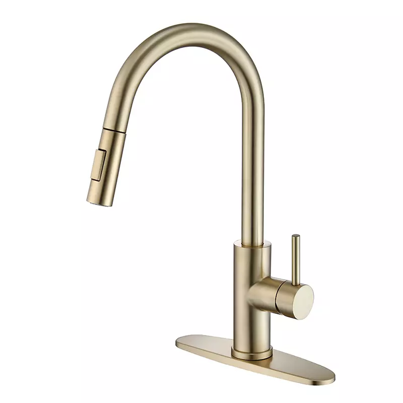 A perfect fit kitchen faucet -Your brushed gold kitchen faucet features an industrial kitchen faucet open spout, compact 43.5cm height fits under most cabinets.